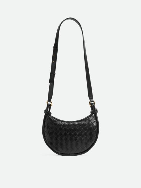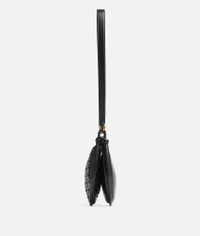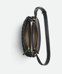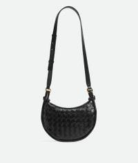 Cross-body bag with Intrecciato leather crescent compartments and adjustable strap. Product Details - Small Intrecciato and smooth leather half-moon cross-body bag with adjustable strap - Two main compartments - Zip closure - Material: Lambskin - Lining: Canvas - Color: Black - Hardware: Brass finish - Height: 15 cm | 5.9" - Width: 26 cm | 10.2" - Depth: 8 cm | 3.1" - Strap drop: 48 cm | 18.9" - Made in: Italy - Product code: 796638V1W511019