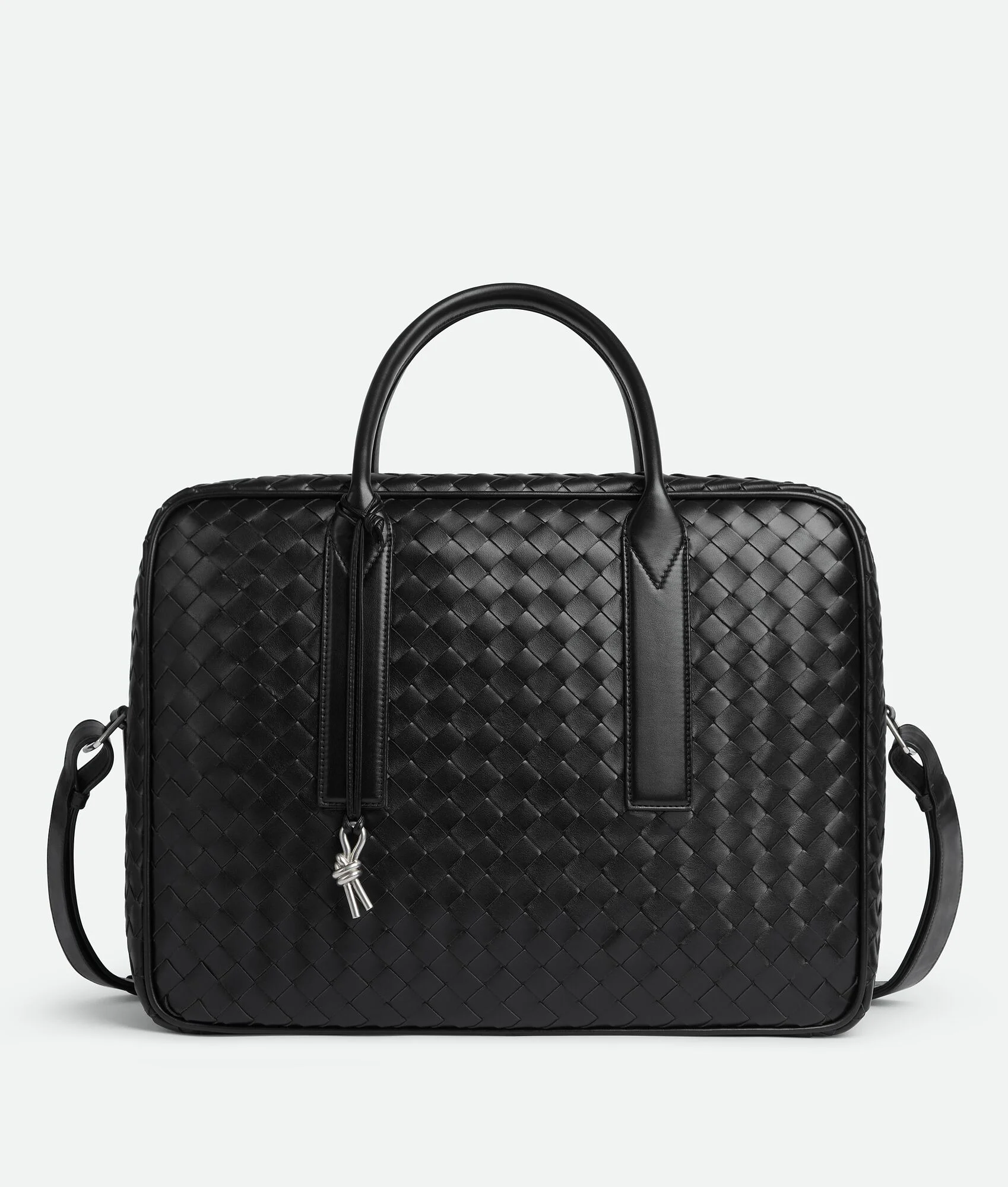 Weekender realised with Intrecciato craftsmanship in soft calfskin leather featuring Product details • Medium Intrecciato weekender with adjustable and removable strap • Padded laptop compartment and one zipped pocket • Zip closure Material: 100% Calfskin • Lining: Canvas • Colour: Black • Hardware: Silver finish • Height: 33 cm | 13" • Width: 43 cm | 16.9" • Depth: 19 cm | 7.5" • Handle drop: 16.5 cm | 6.5" • Strap drop: 45 cm | 17.7" Made in: Italy