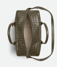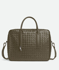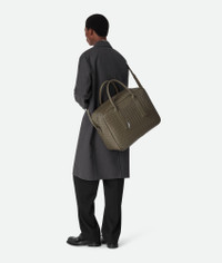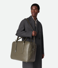 Weekender in soft Intrecciato leather with adjustable strap and signature knot detail. Product Details - Intrecciato weekender with adjustable and detachable strap - Padded laptop compartment and one zipped pocket - Zipper closure - Lining: Canvas - Color: Cypress - Hardware: Silver finish - Height: 33 cm | 13" - Width: 43 cm | 16.9" - Depth: 19 cm | 7.5" - Handle drop: 16.5 cm | 6.5" - Strap drop: 45 cm | 17.7" - Made in: Italy - Product code: 766372V2HL13227 Material - Material: Calfskin