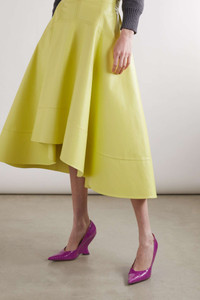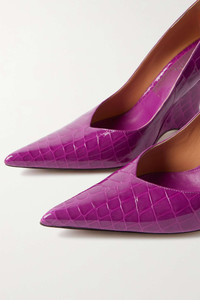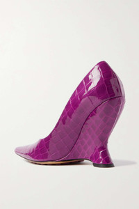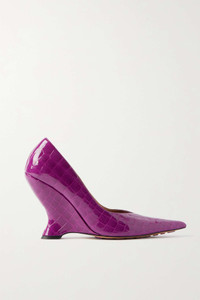 EDITORS'NOTES Bottega Veneta's sculptural 'Gloss' pumps were elegantly modeled on the Fall '22 runway in Milan, which happened to be the debut for Creative Director Matthieu Blazy. Made from croc-effect leather, they have pointy toes and waved wedge heels. Slip yours on with everything from tailored pants to cropped jeans. SIZE & FIT - Fits true to size, take your normal size - Italian sizing DETAILS & CARE - Purple croc-effect leather (Calf) - Slip on - Designer color: Venom