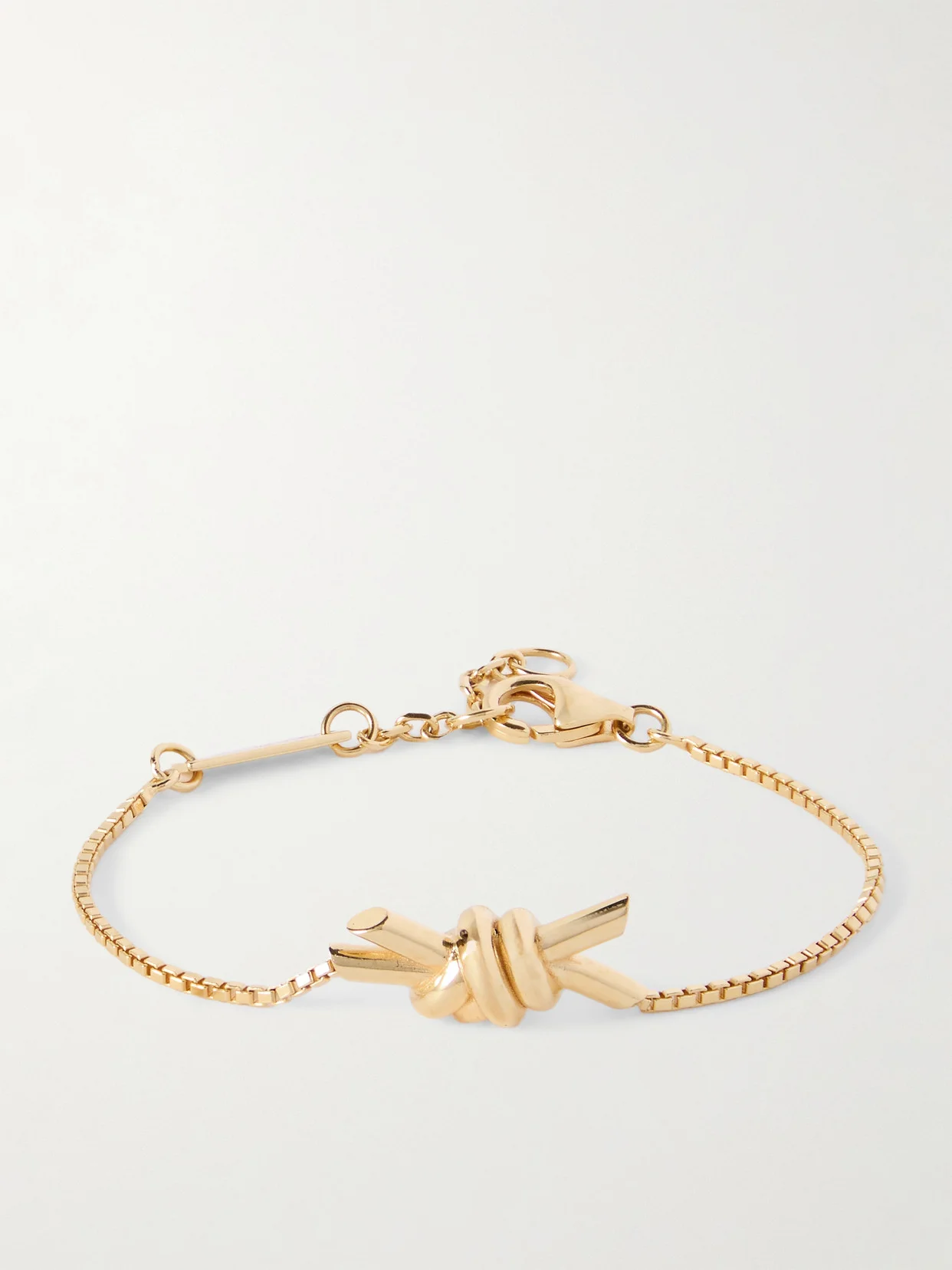 Bottega Veneta's bracelet is strung with the label's signature ‘Knot' - an archival motif that symbolizes the past, present and future. It's been made in Italy from gold-plated silver and has a geometric box chain strung with a rectangular, logo-engraved plaque. Use the lobster clasp to adjust the length.