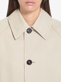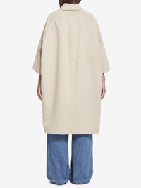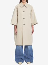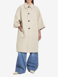 Three-quarter sleeve coccoon-shaped coat in grey silk and cotton twill. It features a pointed collar, front button closure, two hidden side pockets, and an interior with a checked insert. The model is 179cm tall and wears a size IT 40. More Info Product Number : 6195798 Product Code : 834975V5PT02674 The model is 179cm tall and wears a size IT 40. Composition : ext: 57% cotton, 43% silk; int: 100% cotton Made in: Italy