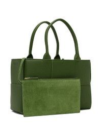 Intreccio-woven pebbled calfskin tote in green. · Twin rolled carry handles at top · Detachable and adjustable shoulder strap · Logo embossed at side · Self-tie fastening at throat · Detachable logo-embossed pouch at interior · Bonded suede lining · H8 x W12.5 x D4.5 in Supplier color: Avocado gold Calfskin. Made in Italy 231798F049002