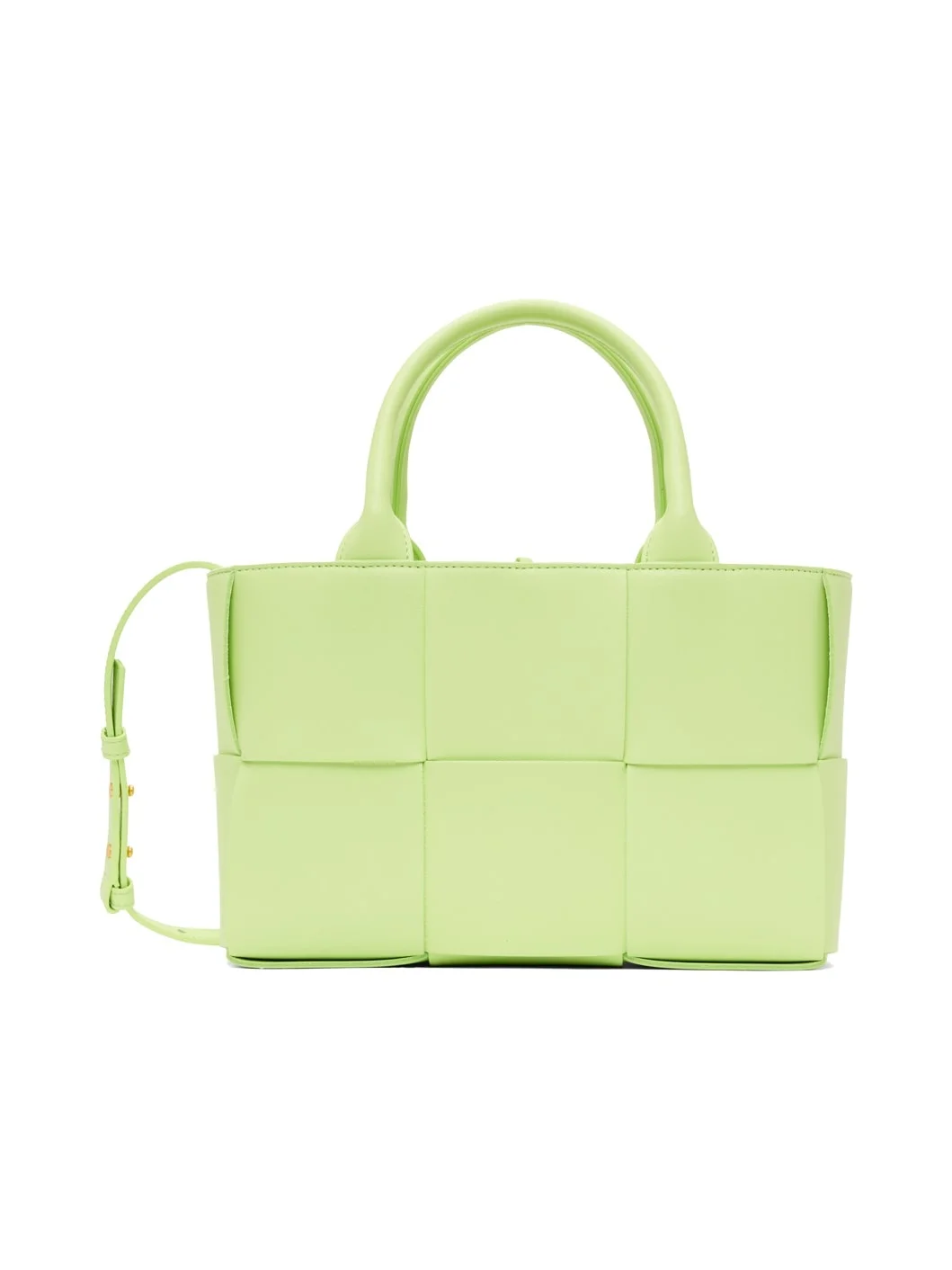 Intreccio-woven buffed calfskin tote in green. · Fixed twin carry handles · Adjustable shoulder strap · Logo embossed at side · Self-tie fastening at open throat · Detachable zip pouch at interior · Unlined · H6.5 x W10 x D3.25 in Supplier color: Fennel/Gold Calfskin. Made in Italy 232798F049005
