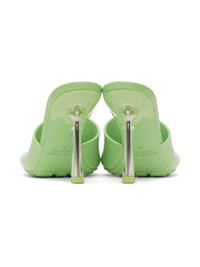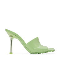 Rubber slip-on heeled sandals in green. · Open square toe · Logo-embossed leather footbed · Transparent covered stiletto heel · Treaded rubber sole · Heel: H3.5 in Supplier color: Pistachio Upper: rubber. Sole: leather, rubber. Made in Italy 222798F125018