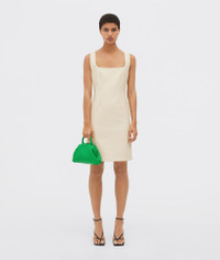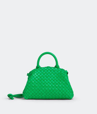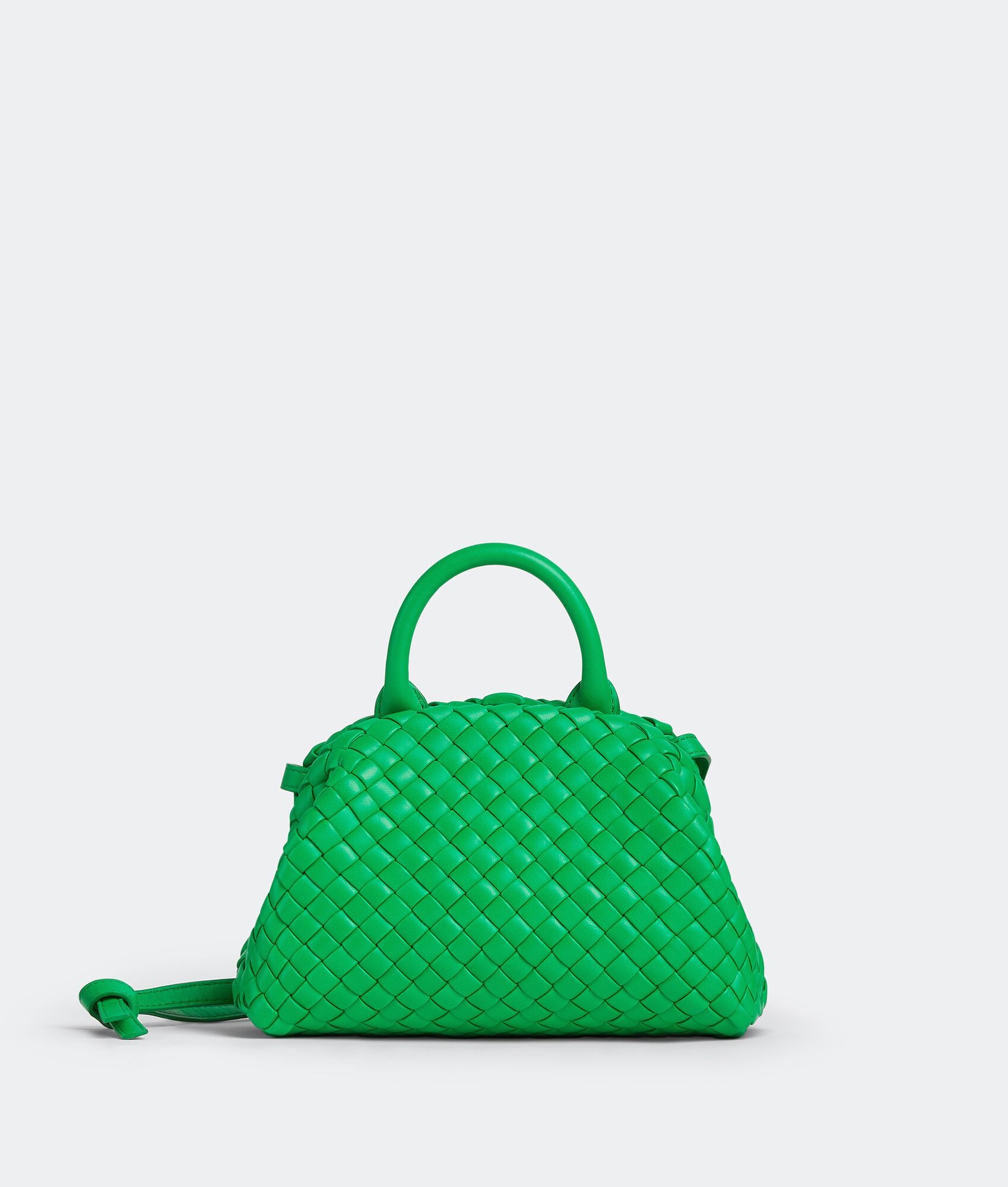 Mini padded intreccio leather top handle bag with detachable strap. This bag Product details • Mini padded intreccio leather top handle bag with detachable strap • Single compartment • Magnetic frame closure Material: 100% Lambskin • Unlined • Color: Parakeet • Hardware: Gold finish • Height: 16.5 cm | 6.5" • Width: 26 cm | 10.2" • Depth: 8 cm | 3.1" • Handle drop: 6.5 cm | 2.6" • Strap drop: 50 cm | 19.7" Made in: Italy