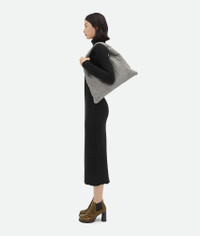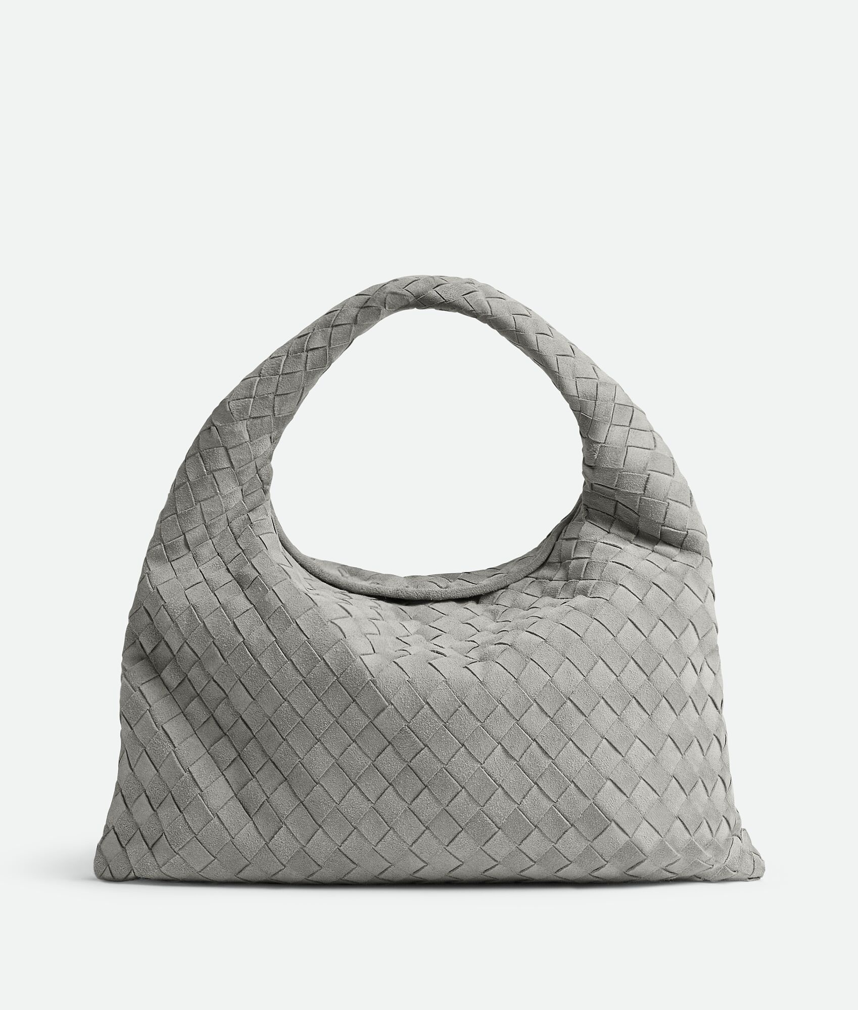 Shoulder bag with Intrecciato craftsmanship in smooth suede. Product Details - Small Intrecciato suede shoulder bag - One internal zipped pocket - Flap closure secured with magnet - Material: calfskin - Lining: Calfskin - Color: Sterling - Hardware: Brass finish - Height: 21 cm | 8.3" - Width: 46 cm | 18.1" - Depth: 10 cm | 3.9" - Handle drop: 20 cm | 7.9” - Made in: Italy - Product code: 796262V1QE31504