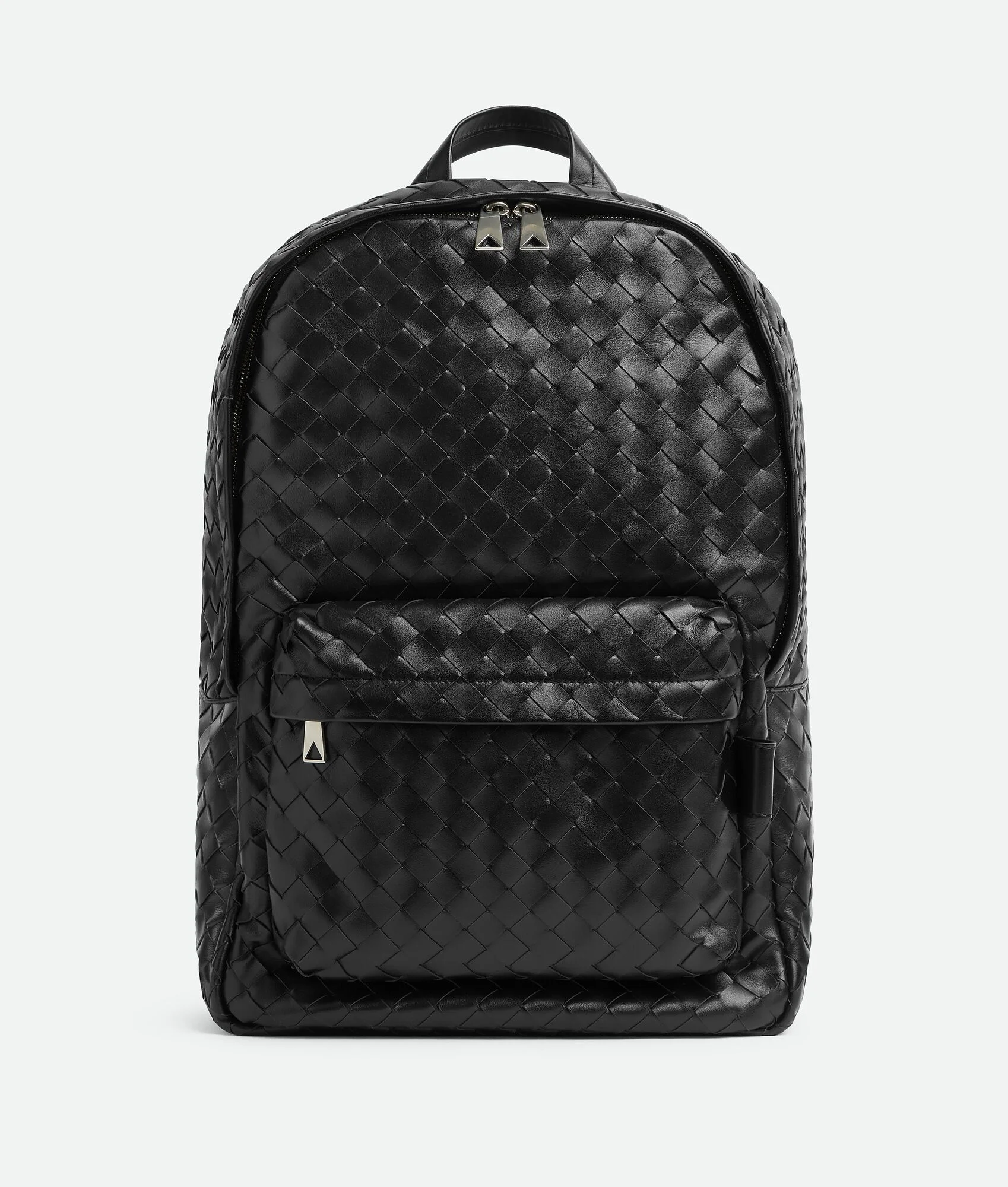 Backpack in soft Intrecciato leather. Product Details - Medium Intrecciato leather backpack - Single exterior zipped pocket - Single interior laptop compartment - Zipper closure - Lining: Suede - Color: Black - Hardware: Silver finish - Height: 46 cm | 18.1" - Width: 30 cm | 11.8" - Depth: 14 cm | 5.5" - Handle drop: 6 cm | 2.4" - Made in: Italy - Product code: 828527V2HL28803 Material - Material: calfskin, polypropylene, polyester