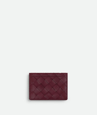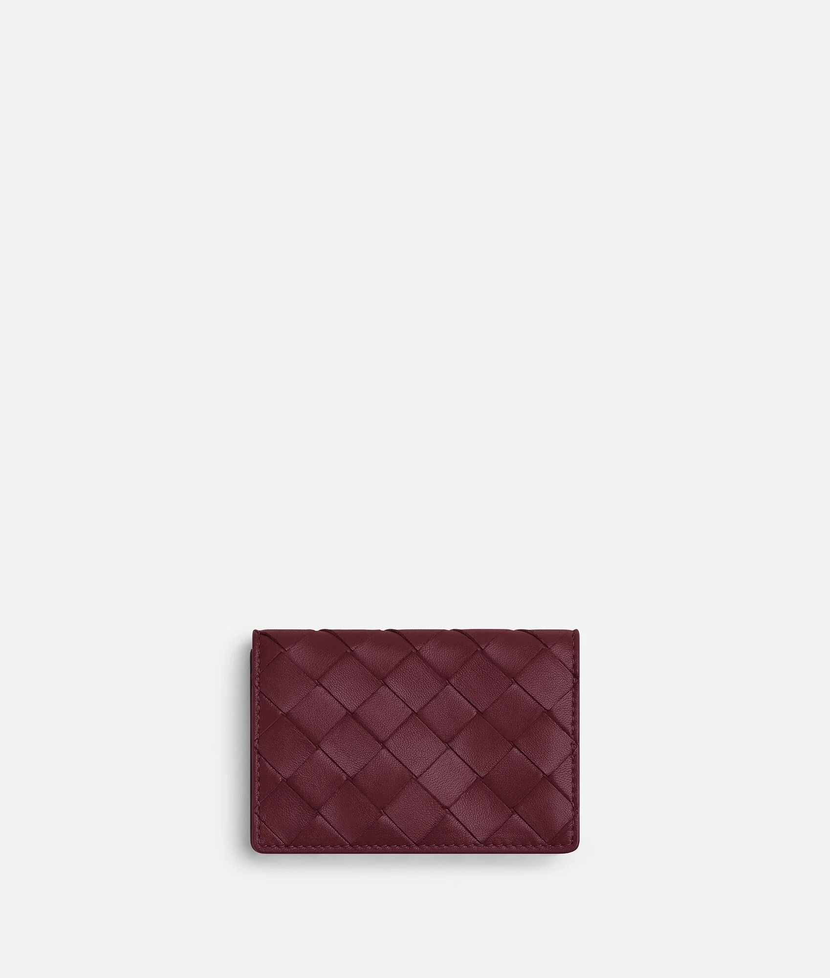 Intrecciato nappa leather business card case. Product Details - Intrecciato leather card case - One compartment, two card slots, one back pocket -Press-stud closure - Material: Lambskin - Lining: Calfskin - Color: Barolo - Hardware: Gold finish - Height: 7.8 cm | 3" - Width: 11 cm | 4.3" - Depth: 2.5 cm | 1" - Made in: Italy - Product code: 814091VCPP32247