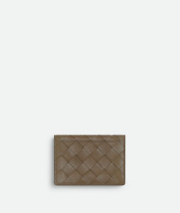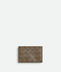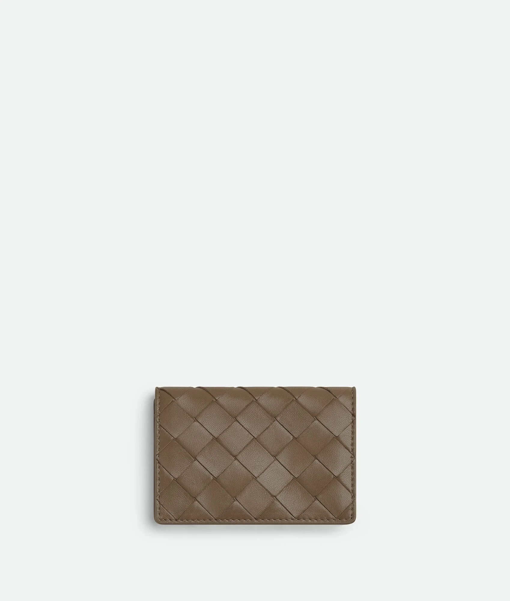 Intrecciato nappa leather business card case. Product Details - One compartment, one card slot, one back pocket - Press stud closure - Material: lambskin - Lining: Calfskin - Color: Pinecone - Hardware: Gold finish - Height: 7.8 cm | 3.1” - Width: 11 cm | 4.3” - Depth: 2.5 cm | 1” - Made in: Italy - Product code: 814091VCPP32355