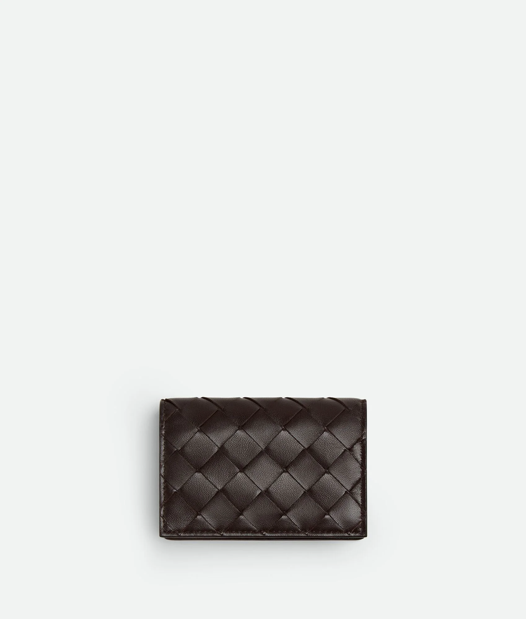 Business card case in Intrecciato nappa leather. Product Details - Intrecciato nappa leather card case - One compartment, one card slot, one back pocket - Press stud closure - Material: Lambskin - Lining: Calf leather - Color: Fondant - Hardware: Gold finish - Height: 7.8 cm | 3.1" - Width: 11 cm | 4.3" - Depth: 2.5 cm | 1" - Made in: Italy - Product code: 814091VCPP32132