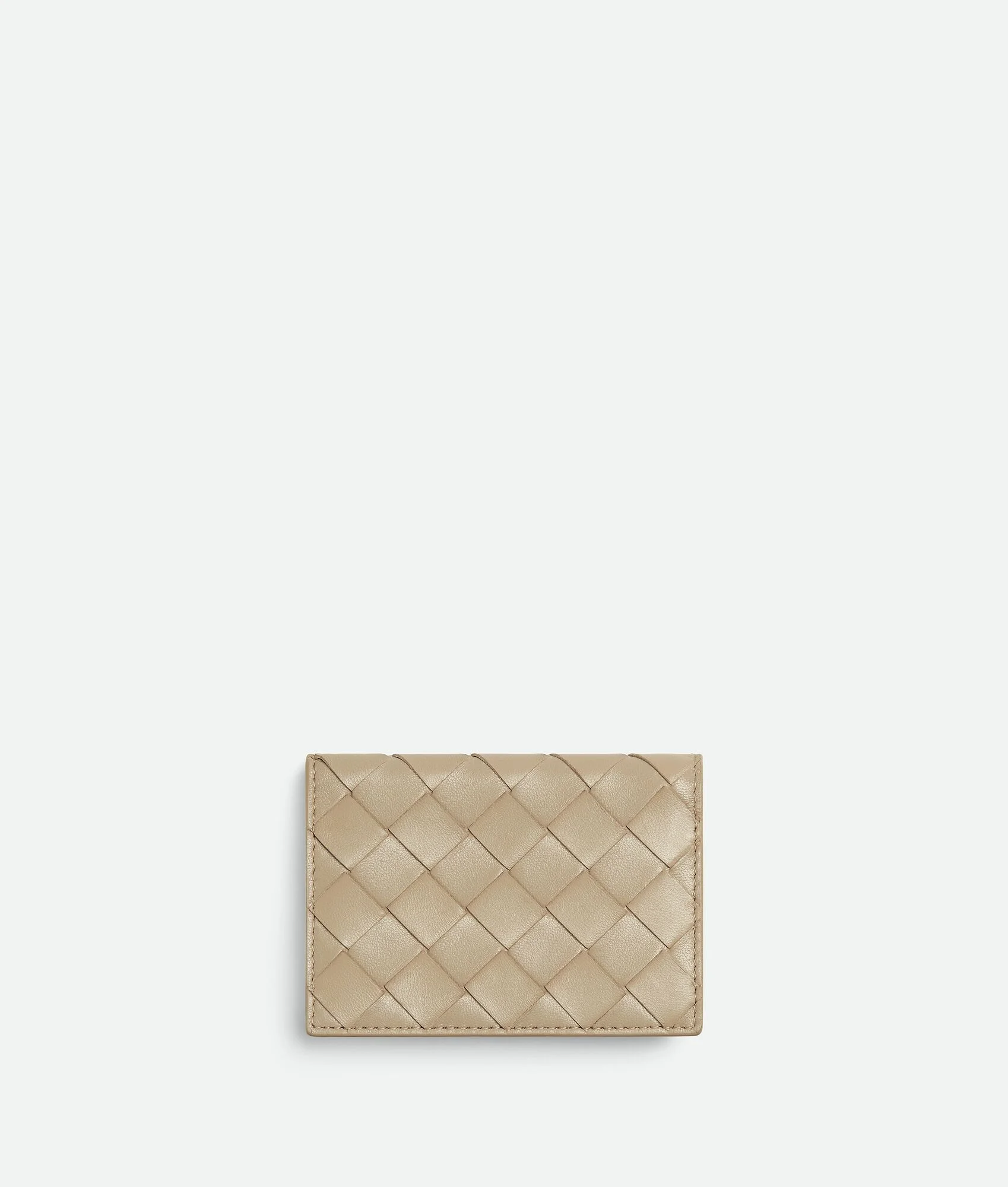 Intrecciato bi-colour nappa leather business card case. Product Details - One compartment, one card slot - Press stud closure - Material: Lambskin - Lining: Calfskin - Colour: Ecru/Glacier - Hardware: Gold finish - Height: 7.8 cm - Width: 11 cm - Depth: 2.5 cm - Made in: Italy - Product code: 814091VCPPU9675
