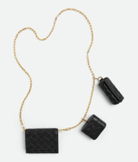 Intrecciato leather card case on chain with detachable AirPods & lipstick cases. Product details • Intrecciato leather card case on chain with detachable AirPods & lipstick cases • One card slot, one detachable chain strap with hooks •Press stud closure Material: 100% Calfskin • Lining: Calfskin • Color: Black • Hardware: Gold finish • Height: 11 cm | 4.3" • Width: 21 cm | 8.3" • Depth: 3 cm | 1.2" • Strap drop: 50 cm | 19.7" Made in: Italy