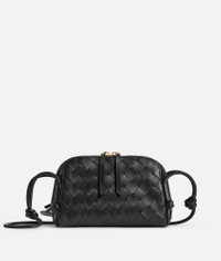 Intrecciato nappa leather pouch with adjustable tubular strap. Product details • One main compartment, one interior flat pocket • Zip closure with leather zip puller • Adjustable leather tubular strap with sliding knots Material: Calfskin • Lining: Calfskin • Color: Black • Hardware: Gold finish • Height: 11.5 cm | 16.9" • Width: 18.5 cm | 16.9" • Depth: 8.5 cm | 3.4" Made in: Italy