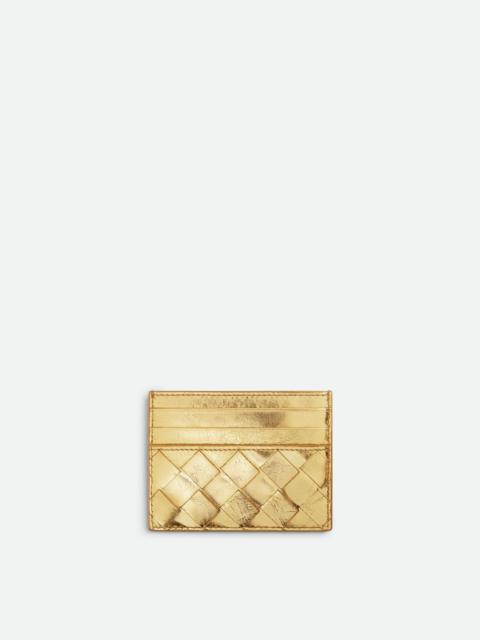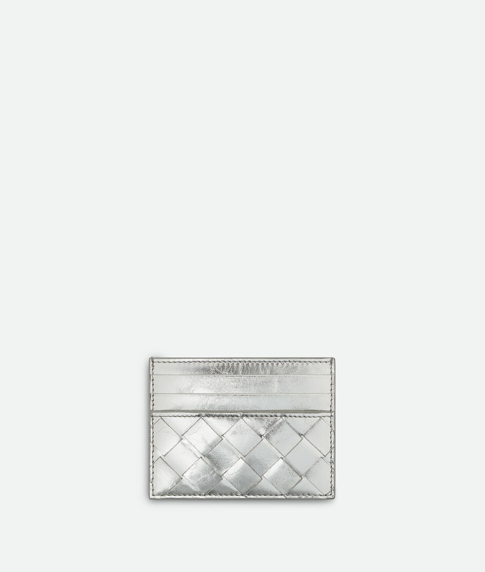 Intrecciato calfskin leather credit card case with foggy mirror effect. Product Details - Six card slots, one central pocket - Material: calfskin - Lining: Calfskin - Color: Silver - Hardware: Silver finish - Height: 8 cm | 3.1” - Width: 10.5 cm | 4.1” - Depth: 0.5 cm | 0.2” - Made in: Italy - Product code: 796324V4P128101