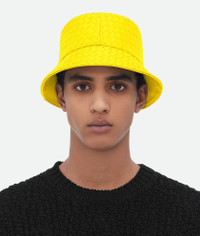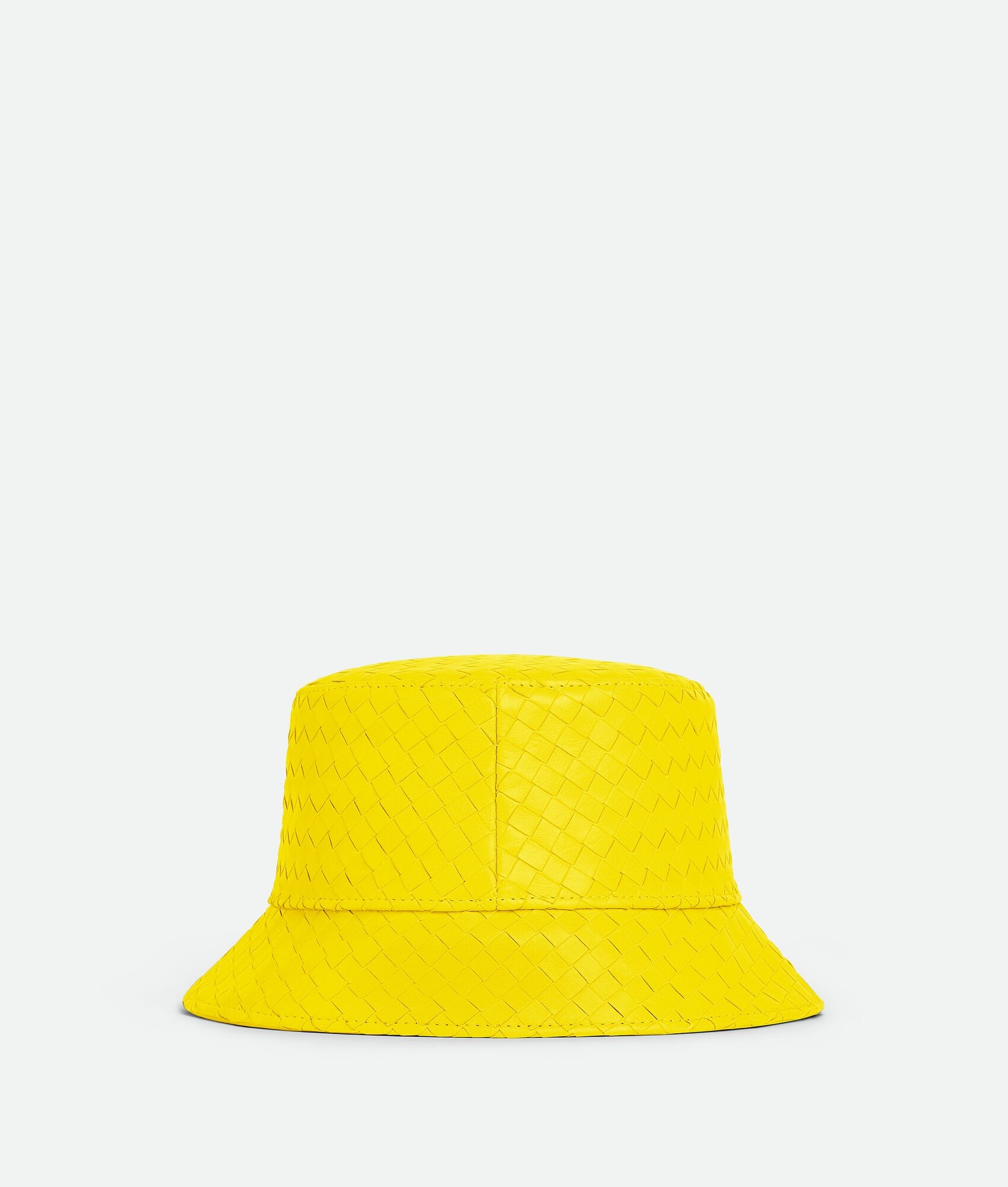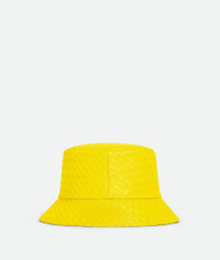 Intrecciato leather bucket hat. Product details • Intrecciato leather bucket hat • Fully lined Material: 100% Lambskin • Color: Lighthouse Made in: Italy
