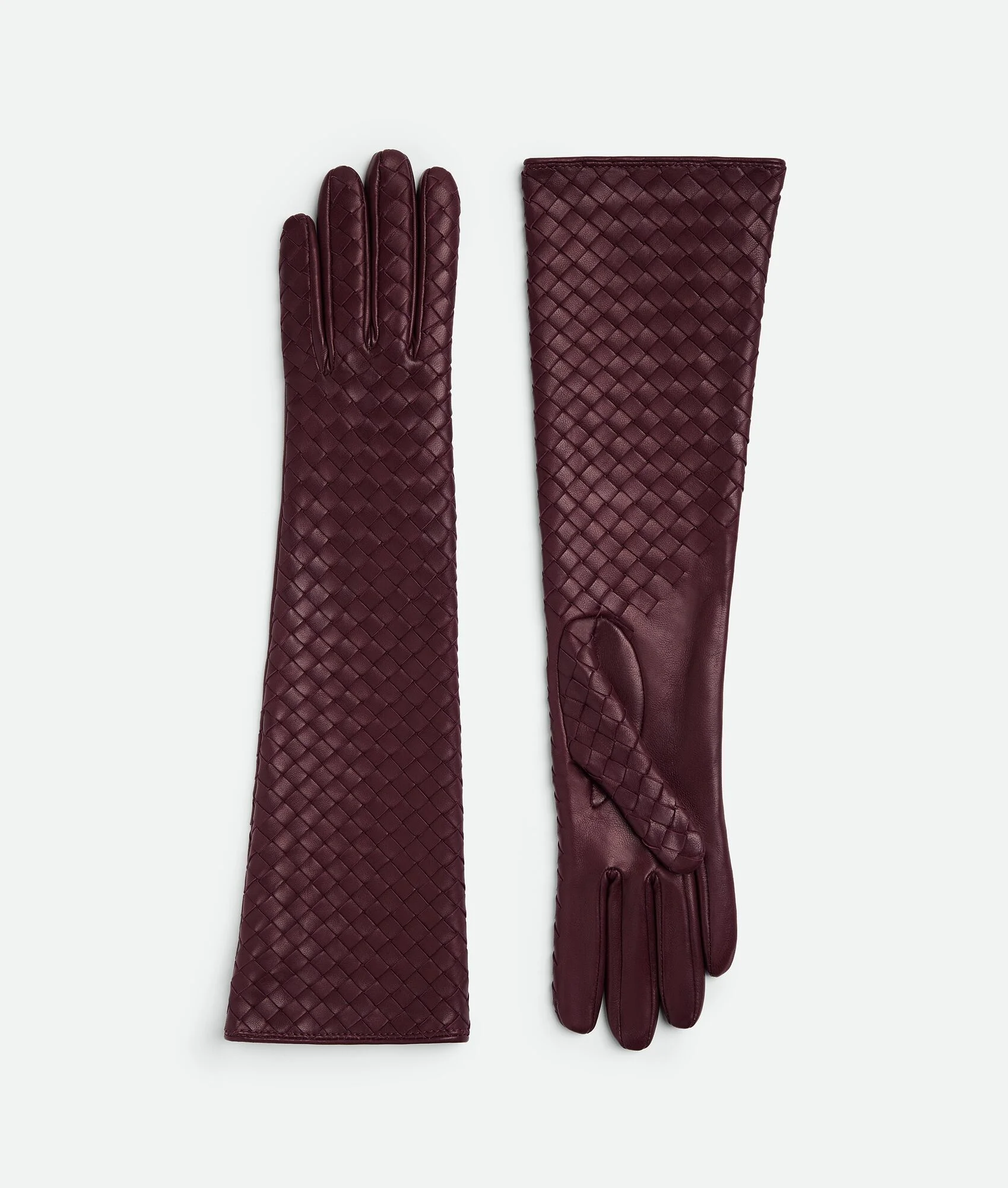 Midi gloves in soft Intrecciato nappa leather with silk lining. Product Details - Intrecciato soft nappa leather midi gloves - Lined in silk - Color: Jam - Made in: Italy - Product code: 715597V01716206 Material - Material: 100% Lambskin