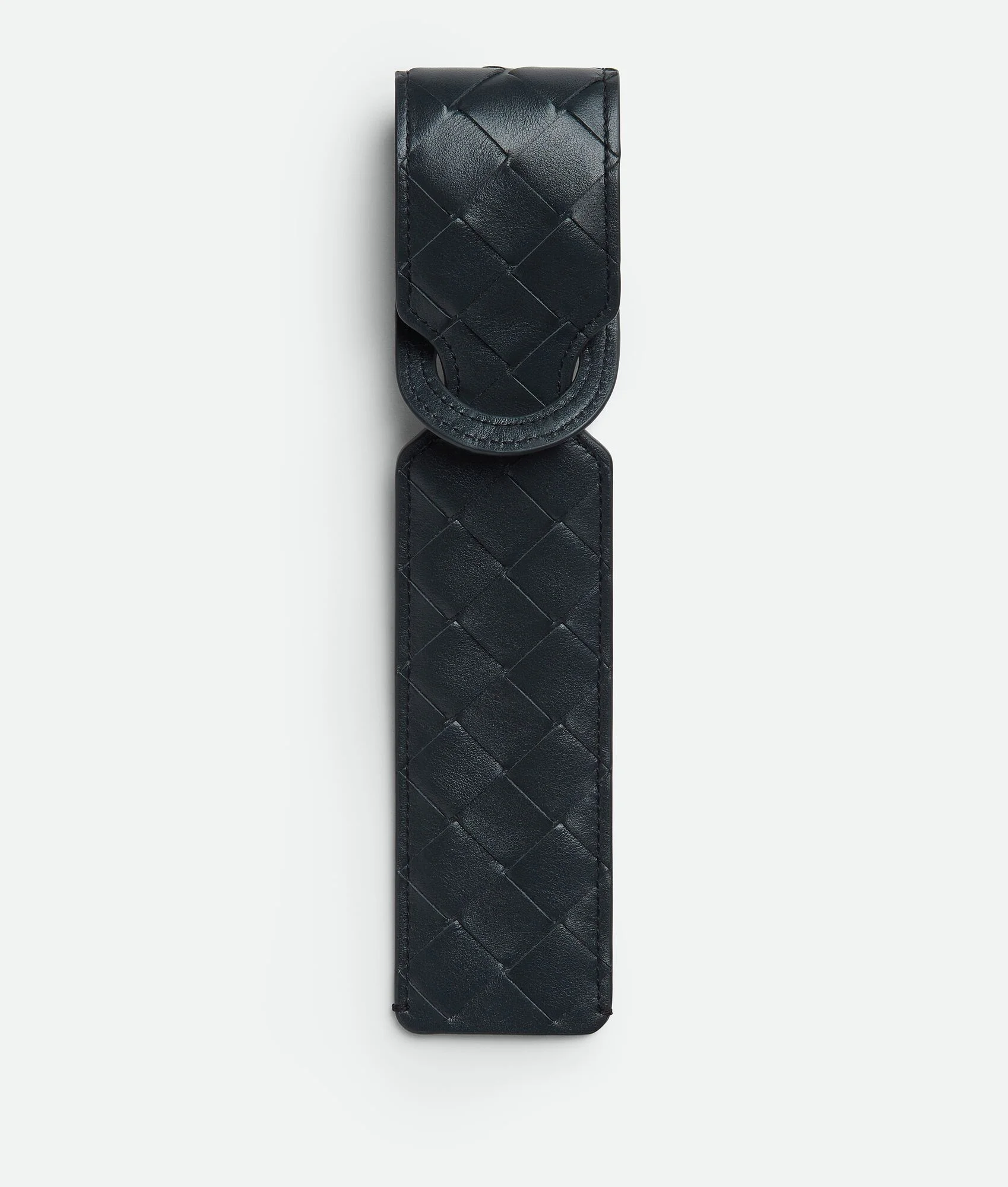 Intrecciato calfskin leather tag holder. Product Details - Window to display paper tag - Paper tag inside for name and address - Material: calfskin - Lining: Calfskin - Color: Shadow - Height: 4.5 cm | 1.8" - Width: 31.5 cm | 12.4" - Depth: 0.5 cm | 0.2” - Made in: Italy - Product code: 786628V2HL14207