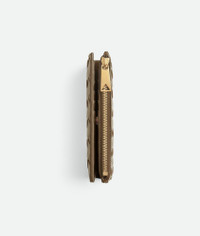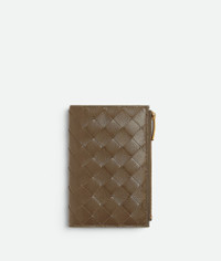 Intrecciato calfskin leather wallet. Product Details - Ten card slots, one note compartment, two additional pockets, one zipped coin purse - Press stud closure - Material: lambskin - Lining: Calfskin - Color: Pinecone - Hardware: Gold finish - Height: 14.5 cm | 5.7” - Width: 9.3 cm | 3.7” - Depth: 2 cm | 0.8” - Made in: Italy - Product code: 749940VCPP22355