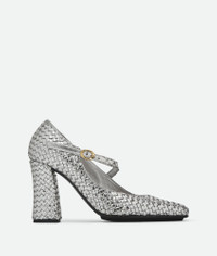 Mary-Jane pump in metallic woven goatskin leather. Product Details - Metallic woven leather Mary-Jane pump - Material: goatskin - Lining: Lambskin - Color: Silver - Rubber-injected leather outsole - Heel: 8.5 cm | 3.3” - Made in: Italy - Product code: 807016V3P711414