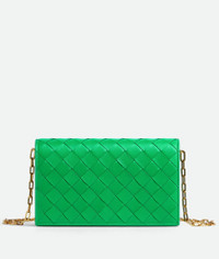 • Mini intrecciato leather cross-body bag on chain • One detachable chain strap with hooks • Two main compartments, six card slots, one additional flat pocket, • Press stud closure Material: 100% Calfskin • Lining: Calfskin • Color: Parakeet • Hardware: Gold finish • Height: 11 cm | 4.3" • Width: 18 cm | 7.1" • Depth: 4.5 cm | 1.8" • Strap drop: 55 cm | 21.7" Made in: Italy