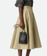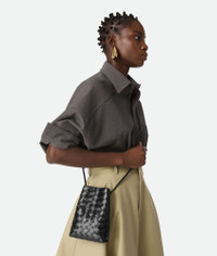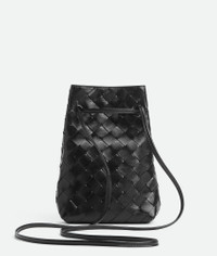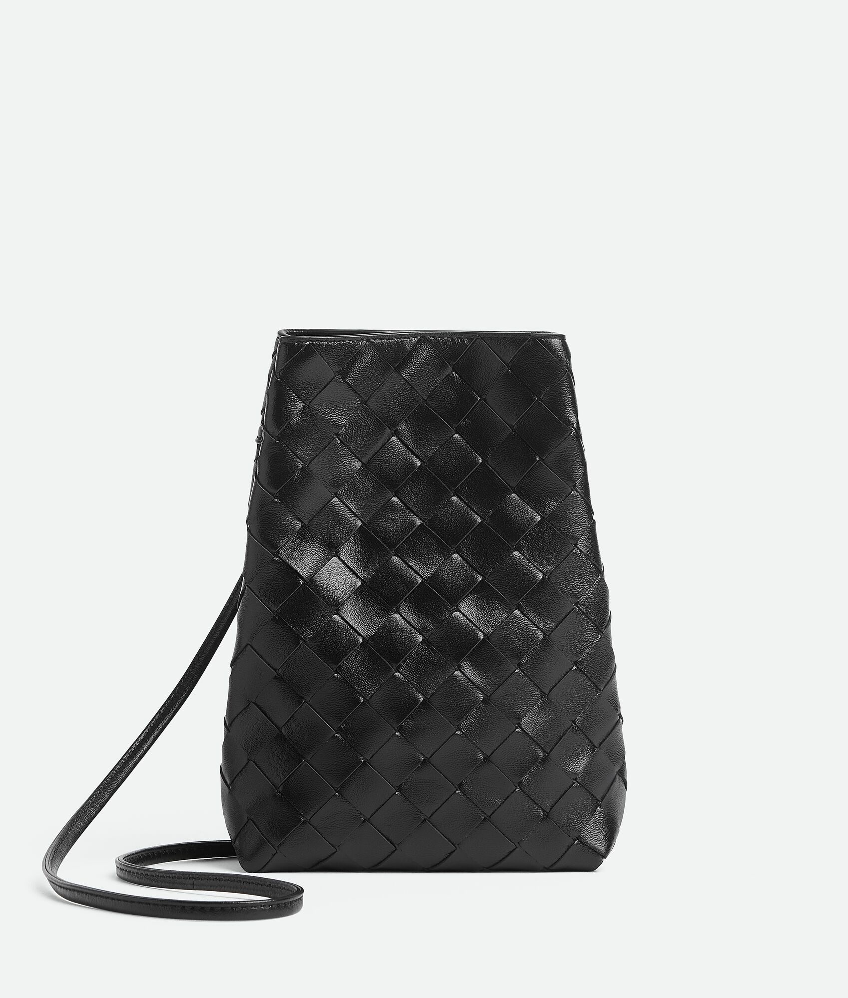 Intrecciato calf leather phone pouch with sliding strap. Product Details - Single main compartment - Magnetic closure - Sliding leather strap - Material: Calfskin - Lining: Canvas - Colour: Black - Hardware: Gold finish - Height: 20.5 cm - Width: 13 cm - Depth: 5.5 cm - Strap drop: 55 cm - Made in: Italy - Product code: 827676V3IV08425