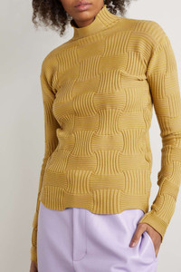 EDITORS'NOTES Bottega Veneta has a way of making something as simple as a turtleneck sweater recognizable. This one is made from insulating wool-blend that's ribbed to resemble the brand's legendary intrecciato motif. Complement the 'Camel Butterscotch' hue with pastel pants. SIZE & FIT - Fits true to size, take your normal size - Designed for a close fit - Lightweight knit - Model is 177cm/ 5'10" and is wearing a size Small DETAILS & CARE - Yellow and camel wool-blend - Slips on - 91% wool, 7% polyamide, 2% elastane - Designer color: Camel Butterscotch