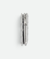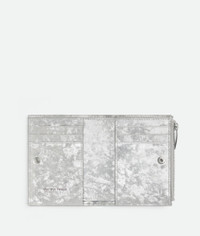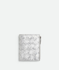 Small bi-fold wallet in Intrecciato laminated leather with satin finish. Product Details - Intrecciato lamina satin leather wallet - Six card slots, one note compartment, one zipped coin purse - Press-stud closure - Lining: Calf leather - Color: Silver - Hardware: Silver finish - Made in: Italy - Product code: 742330V5XF18101 Material - Material: Lambskin Size & Fit - Height: 11.5 cm | 4.5" - Width: 9 cm | 3.5" - Depth: 1 cm | 0.4"