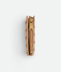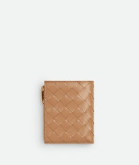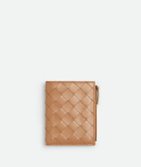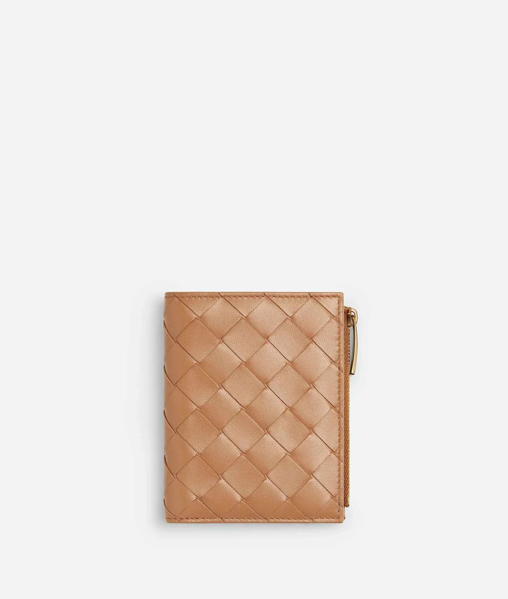 Small bi-fold wallet in Intrecciato nappa leather. Product Details - Intrecciato nappa leather wallet - Six card slots, one note compartment, one zipped coin purse - Press-stud closure - Lining: Calf leather - Color: Pale Brown - Hardware: Gold finish - Made in: Italy - Product code: 742330VCPP32787 Material - Material: 100% lambskin Size & Fit - Height: 11.5 cm | 4.5" - Width: 9 cm | 3.5" - Depth: 1 cm | 0.4"