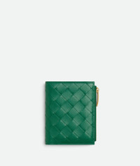 Small bi-fold wallet in Intrecciato nappa leather. Product Details - Intrecciato nappa leather wallet - Six card slots, one note compartment, one zipped coin purse -Press stud closure - Lining: Calfskin - Color: Jungle - Hardware: Gold finish - Made in: Italy - Product code: 742330VCPP33197 Material - Material: Lambskin Size & Fit - Height: 11.5 cm (4.5") - Width: 9 cm (3.5") - Depth: 1 cm (0.4")