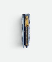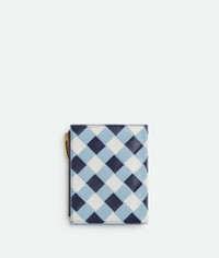 Small bi-fold wallet in Intrecciato nappa leather with vichy pattern. Product Details - Small Intrecciato vichy nappa leather bi-fold wallet - Six card slots, one note compartment, one zipped coin purse - Press stud closure - Material: Lambskin - Lining: Calf leather - Color: Abyss/Ice/White - Hardware: Gold finish - Height: 11.5 cm | 4.5" - Width: 9 cm | 3.5" - Depth: 1 cm | 0.4" - Made in: Italy - Product code: 742330V5QI14150
