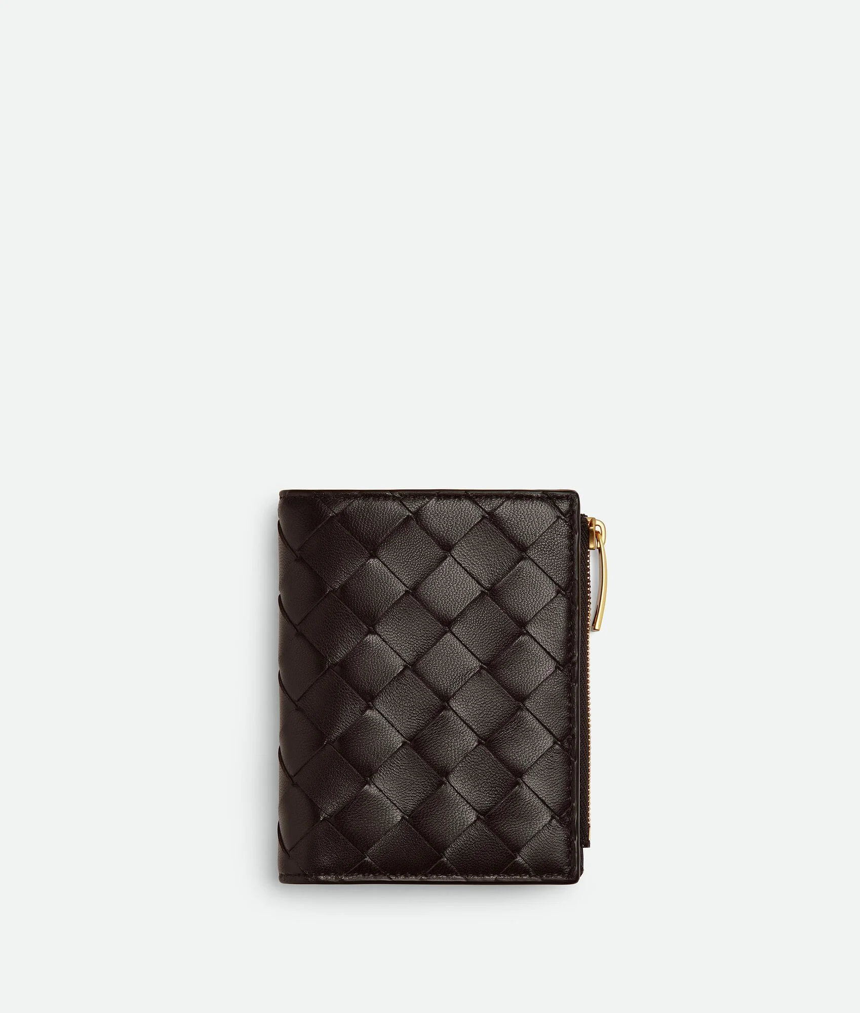 Small bi-fold wallet in Intrecciato nappa leather. Product Details - Small Intrecciato nappa leather bi-fold wallet - Six card slots, one note compartment, one zipped coin purse - Press stud closure - Material: Lambskin - Lining: Calf leather - Color: Fondant - Hardware: Gold finish - Height: 11.5 cm | 4.5" - Width: 9 cm | 3.5" - Depth: 1 cm | 0.4" - Made in: Italy - Product code: 742330VCPP32132