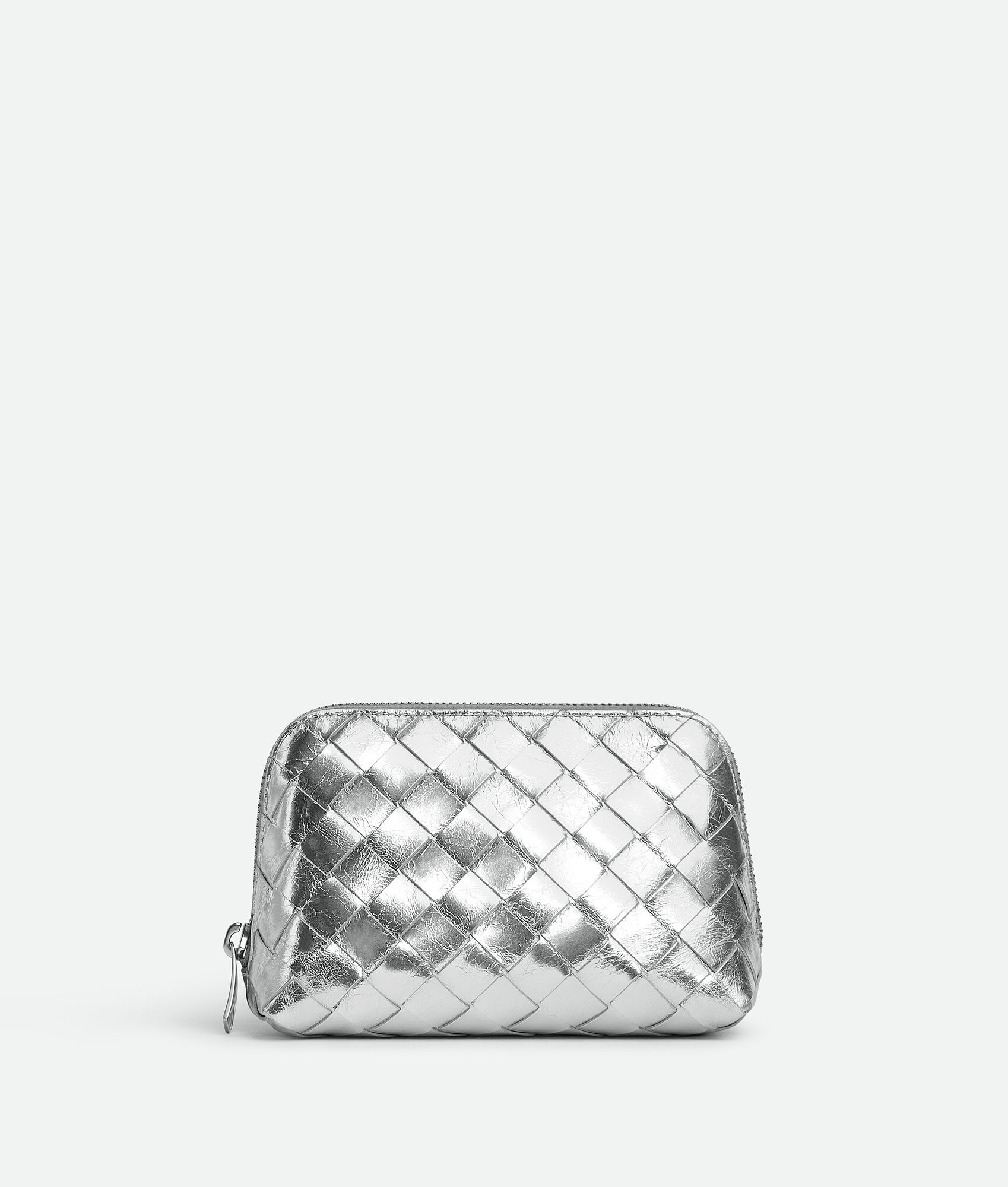 Intrecciato calfskin leather pouch with foggy mirror effect. Product Details - One main compartment, one interior flat pocket - Zipper closure - Material: calfskin - Lining: Calfskin - Color: Silver - Hardware: Silver finish - Height: 10.5 cm | 4.1” - Width: 16.5 cm | 6.5” - Depth: 9 cm | 3.5” - Made in: Italy - Product code: 764044V4P108101