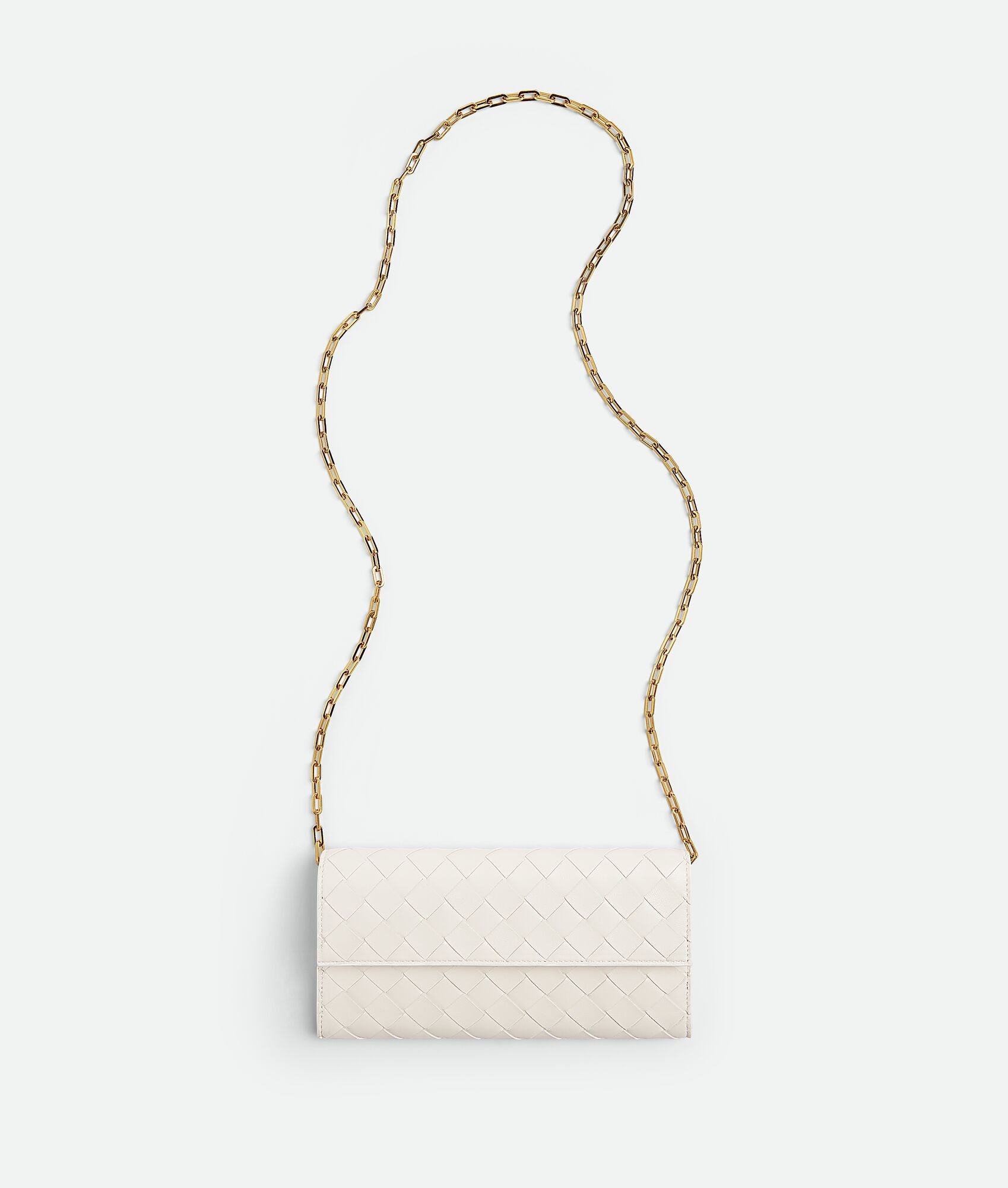 Intrecciato leather wallet on chain. Product details • Intrecciato leather wallet on chain • Two main compartments, six card slots, one additional flat pocket, one detachable chain strap, one zipped coin purse •Press stud closure Material: 100% Calfskin • Lining: Calfskin • Color: Chalk • Hardware: Gold finish • Height: 11 cm | 4.3" • Width: 21 cm | 8.3" • Depth: 3 cm | 1.2" • Strap drop: 50 cm | 19.7" Made in: Italy