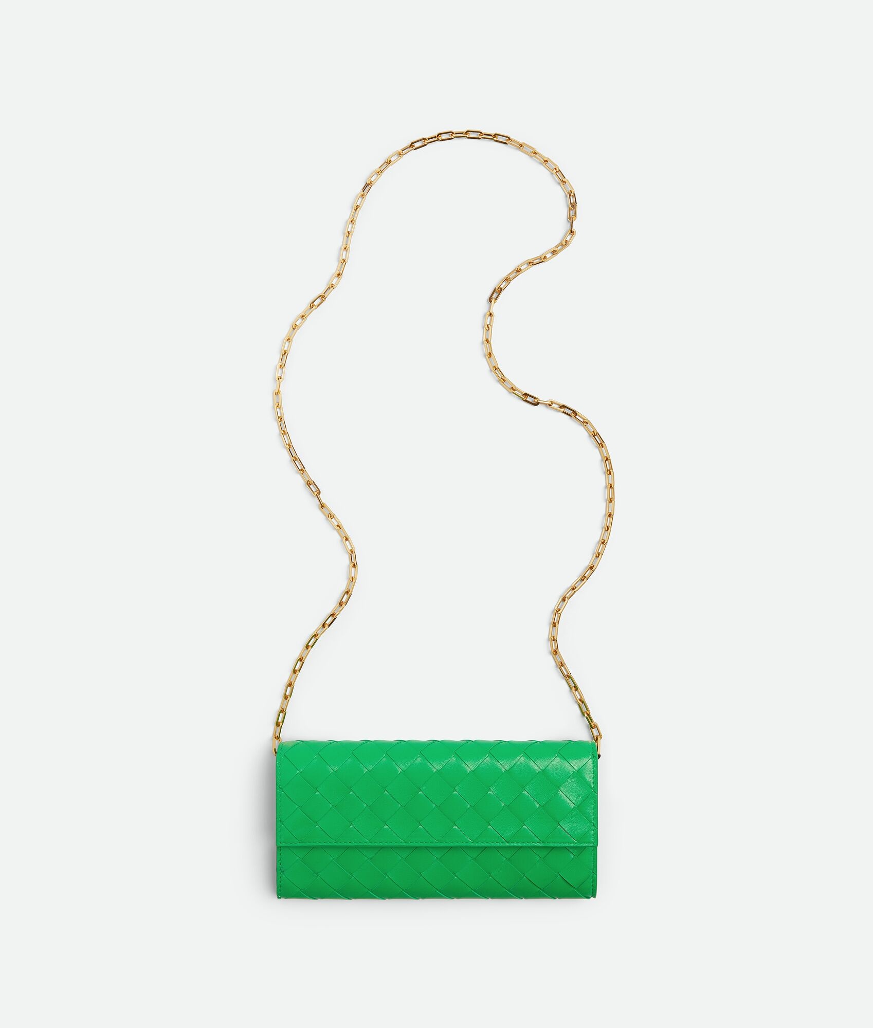 • Intrecciato leather wallet on chain • Two main compartments, six card slots, one additional flat pocket, one detachable chain strap, one zipped coin purse • Press stud closure Material: 100% Calfskin • Lining: Calfskin • Color: Parakeet • Hardware: Gold finish • Height: 11 cm | 4.3" • Width: 21 cm | 8.3" • Depth: 3 cm | 1.2" • Strap drop: 50 cm | 19.7" Made in: Italy