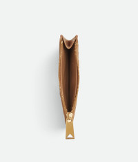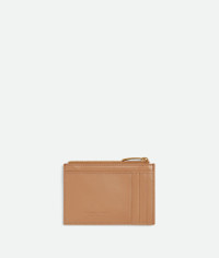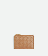 Zipped card case in Intrecciato nappa leather. Product Details - Intrecciato nappa leather card case - Three card slots, one additional pocket, one zipped coin purse with gusset - Lining: Calf leather - Color: Pale brown - Hardware: Gold finish - Made in: Italy - Product code: 806032VCPP32787 Material - Material: Lambskin Size & Fit - Height: 8.2 cm | 3.2" - Width: 12 cm | 4.7" - Depth: 0.5 cm | 0.2"