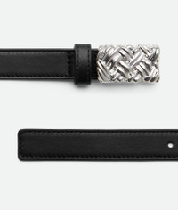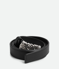 Smooth calfskin leather belt with Intreccio pattern buckle. Product Details - Pin closure - Material: Calfskin - Lining: Calfskin - Color: Black - Hardware: Silver finish - Height: 2 cm | 0.8" - Depth: 0.5 cm | 0.2" - Made in: Italy - Product code: 799697VALKO8803