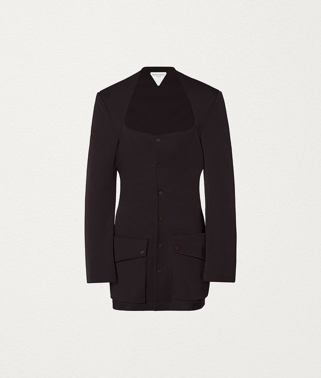 • Single breasted jacket in technical gabardine • Exaggerated patch pockets at the front • Fitted at the waist • Open neck • Button fastening DETAILS Composition: 89% Polyamide, 11% Elastane Color: Chocolate Made in Italy