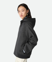 Hooded blouson in double face wool with leather piping. Product Details - Double-face wool hooded blouson - Leather piping - Zipper closure - Half lined - Relaxed fit - Color: Charcoal Melange - Made in: Italy - Product code: 834986V4CB01307 Size & Fit - Model is 177 cm | 5'9" and is wearing a Bottega Veneta size 38