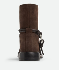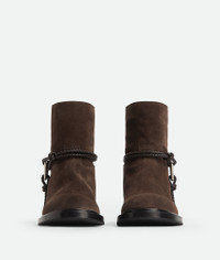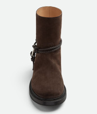 Product Details - Suede leather ankle trunk - Coaxial detailing with signature metallic triangle element - Lining: Calfskin - Color: Fondant - Hardware: Silver finish - Leather outsole with Goodyear construction - Made in: Italy - Product code: 843951V4QN02113 Material - Material: Calfskin