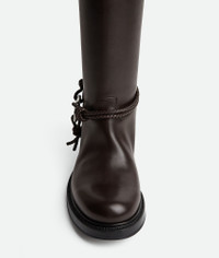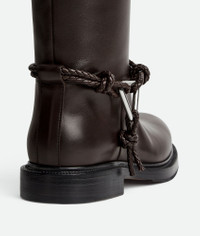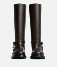Knee high boot in calfskin leather with coaxial detailing and signature metal triangle. Product Details - Leather knee-high boot - Coaxial detailing with signature metallic triangle element - Lining: Calf leather - Color: Fondant - Hardware: Silver finish - Leather outsole with Goodyear construction - Made in: Italy - Product code: 843952V60E02113 Material - Material: Calfskin, lambskin