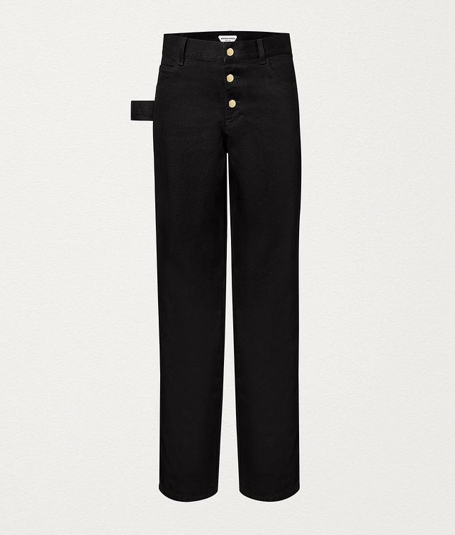• High-waisted straight leg jeans • Exposed button-fastening fly • Five-pocket style with flat carpenter loop • Back pockets with V-stitching • Belt loops • Classic fit DETAILS Composition: 100% Cotton Color: Nero Made in Italy