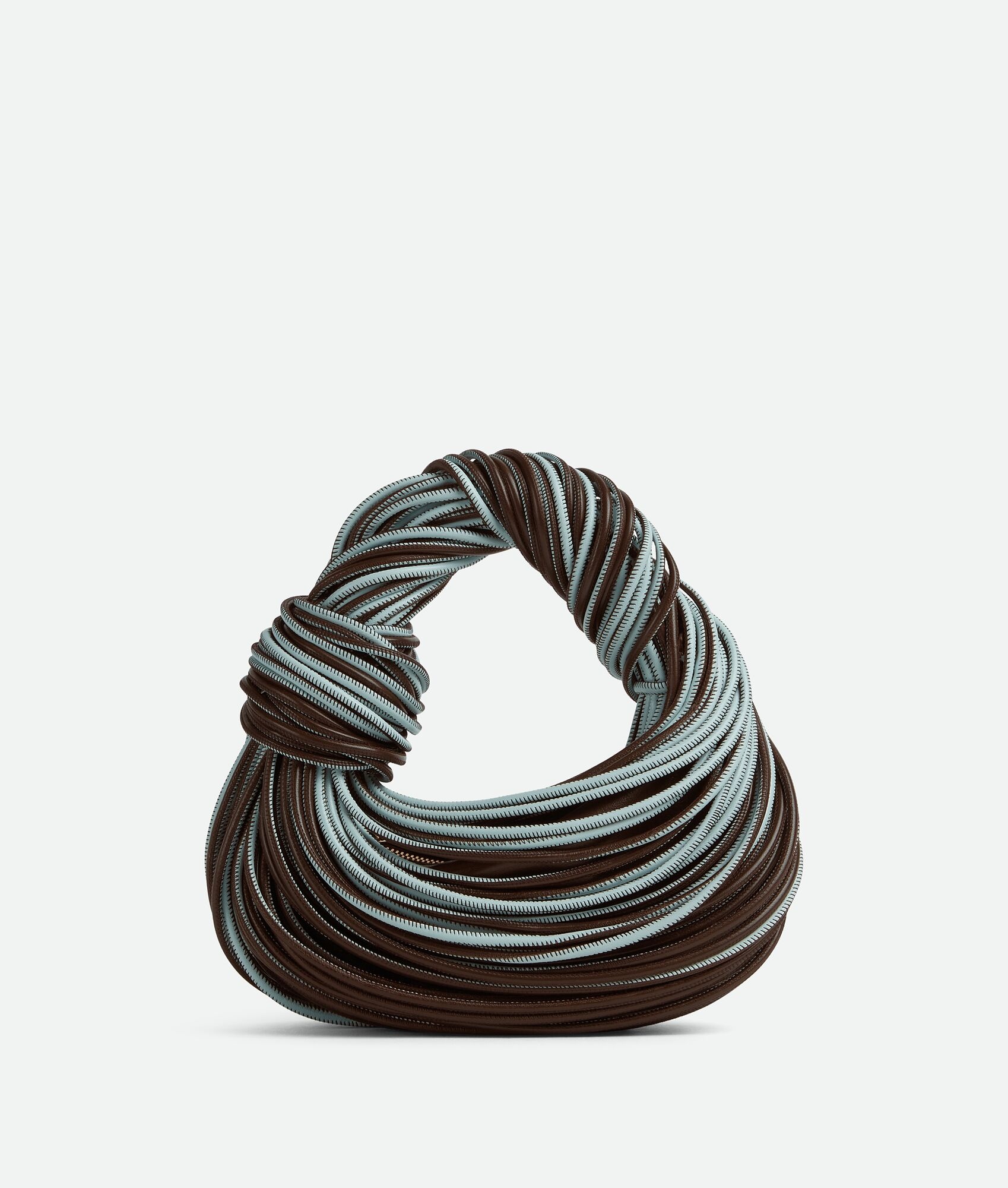 Top handle bag in tubular lambskin leather with soft rounded shape and signature Product details • Mini bicolor tubular leather top handle bag • Single compartment • Zipper closure Material: 100% Calfskin • Lining: Calfskin • Color: Light Brown-Teal Washed • Hardware: Gold finish • Height: 23 cm | 9.1" • Width: 28 cm | 11" • Depth: 8 cm | 3.15" • Handle drop: 10 cm | 3.9" Made in: Italy