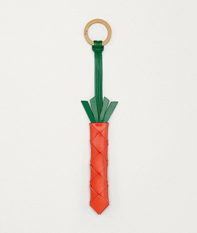 • Carrot design key chain in Intrecciato leather • Split metal key ring DETAILS Composition: 100% Lambskin Color: Orange, Racing Green Hardware: Gold finish Height: 24 cm / 9.4" Width: 3 cm / 1.1" Depth: 1 cm / 0.4" Made in Italy