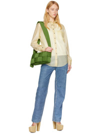 Padded intrecciato-woven nylon taffeta messenger bag in khaki. · Adjustable shoulder strap · Foldover flap with magnetic fastening · Detachable zip pouch at interior · Unlined · H13 x W6 x D3 in Supplier color: Avocado/Silver Textile. Made in Italy 231798F048071