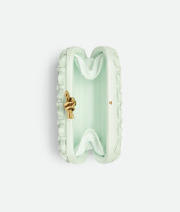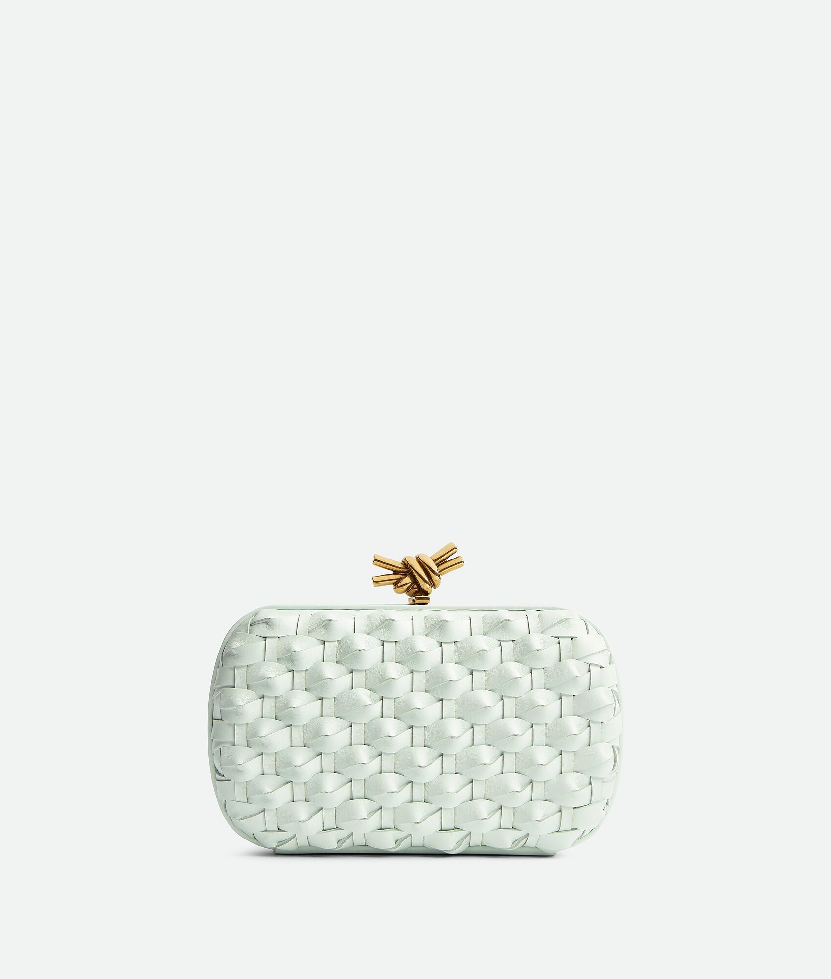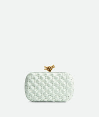 Minaudière clutch meticulously crafted from knotted Intreccio leather with signature Product details • Knotted Intreccio leather minaudière • Single compartment • Metallic knot clasp closure Material: 100% Calfskin • Lining: Calfskin • Color: Glacier • Hardware: Brass finish • Height: 11.5 cm | 4.5" • Width: 19 cm | 7.5" • Depth: 5 cm | 2" Made in: Italy