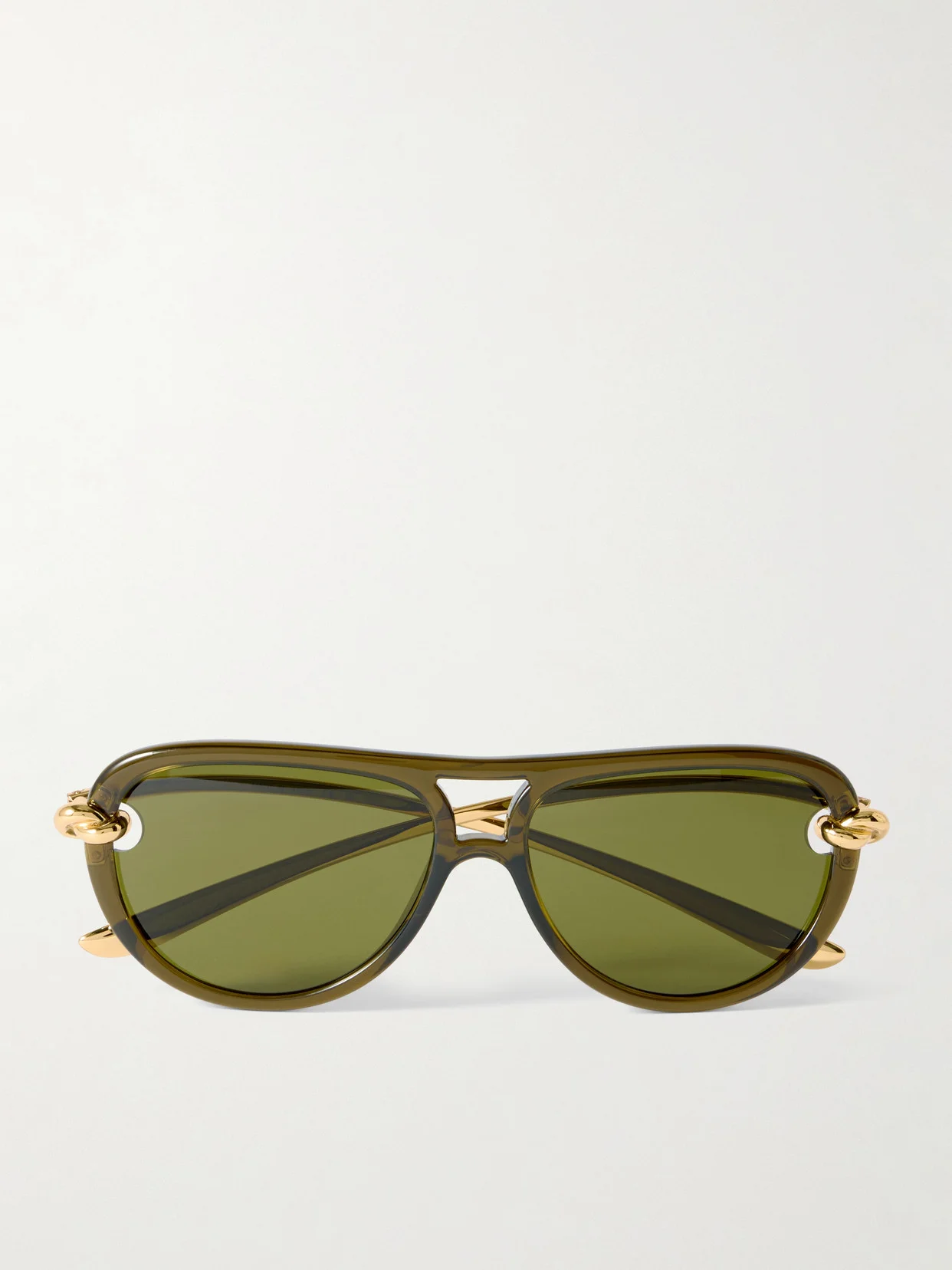 Bottega Veneta Eyewear's sunglasses channel retro style with modern, sculptural elements. Made in Japan from gold-tone metal that's molded into the signature knots at the temples, they have glossy acetate aviator-style frames and green lenses.