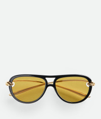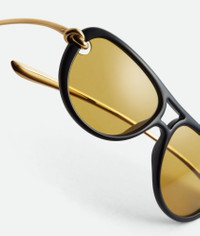 Aviator sunglasses in polyamide with sleek temples, featuring signature knot details. Product Details - Aviator sunglasses made with polyamide and metal - Lenses featuring cutouts to highlight the knot detail on both sides - Metal temples with aerodynamic shape - Lenses made from polyamide with 39% bio-based content - Frame made from polyamide with 60% bio-based content - BV1418S 001 - Color: Black/Yellow - Made in: Japan - Product code: 841235VBL801281 Material - Material: Polyamide, Metal Size & Fit - Lens width: 58 mm | 2.3" - Bridge length: 15 mm | 0.6" - Temple length: 145 mm | 5.7"