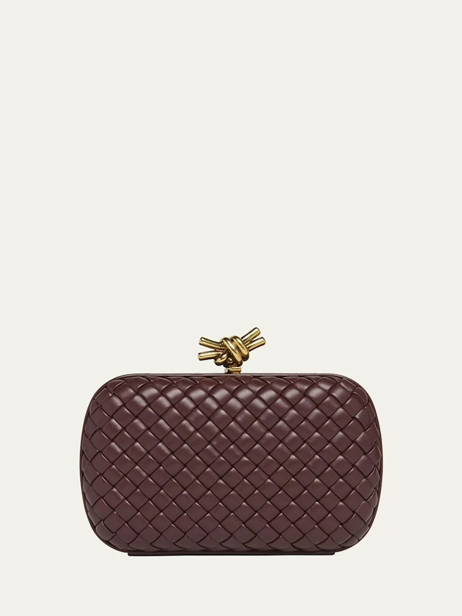 Bottega Veneta clutch bag in intreccio leather Detachable chain shoulder strap Can be worn as a clutch or shoulder bag Knot lift-clasp closure Approx. 4.5"H x 7.5"W x 2"D Made in Italy Online Inquiries: BGS21_V63J1| Store Inquiries: #4681098