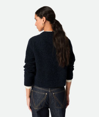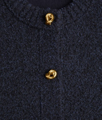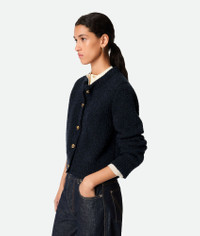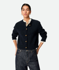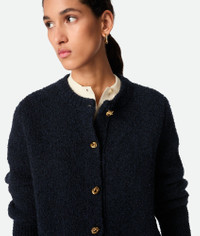 Cardigan in wool boucle. Product Details - Wool boucle cardigan - Metal knot buttons closure - Regular fit - Material: 49% cotton, 41% wool, 9% polyamide, 1% elastane - Color: Navy - Made in: Italy - Product code: 812469V4WQ04121 Size & Fit - Model is 175 cm | 5'9" and is wearing a Bottega Veneta size S